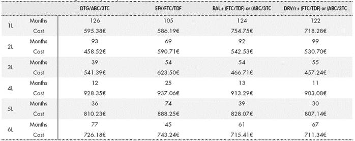 This effectiveness is consistent with the proposed treatment algorithms since all alternatives are favoured by having treatments including DTG in subsequent lines. Thus, the effectiveness shown in the first lines of treatments is consistent with the efficacy results of the comparative clinical trials of the treatments evaluated12-17. And this dominance is consistent with the results of previous research compararing DTG with ABC/3TC or FTC/ TDF in Canada29.