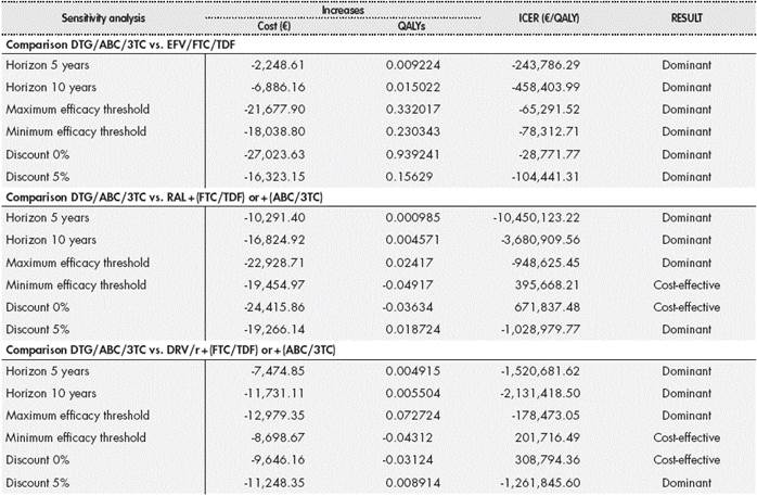 In order to assess the consistency of the model and the effect on its results of the relative efficacy of DTG/ABC/3TC versus its alternatives, the time horizon and discount rate applied, as recommended by the proposed Spanish guidelines for economic evaluation28, the following sensitivity analy-ses were performed: