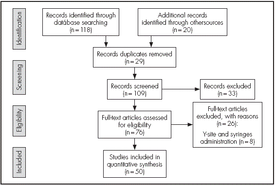 Excluded records were in base of a repetition of the article or because obtained information was based in subcutaneous or Y-site administration, being the required compatibility of the admixture larger in case of parenteral administration.