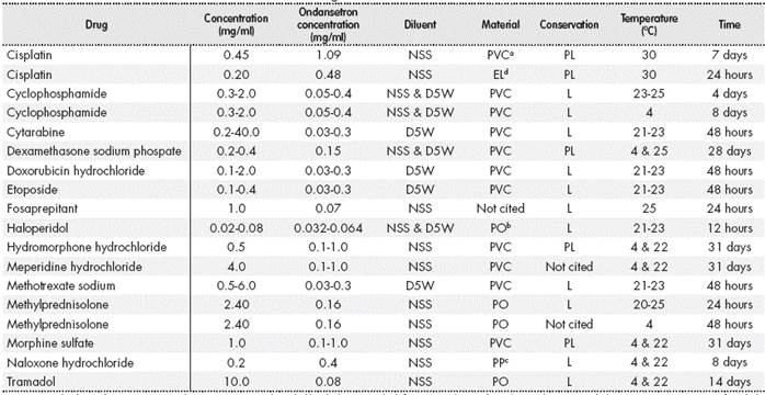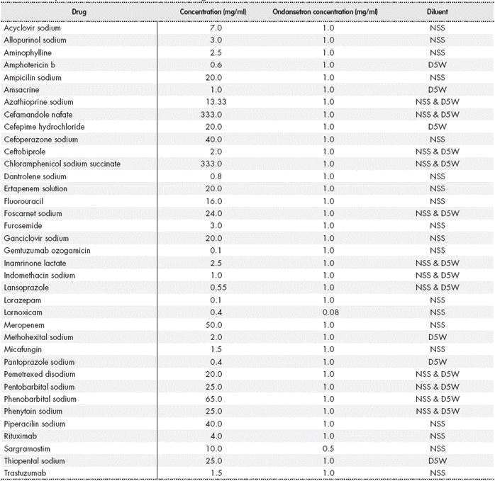 Ondansetron plus another immunosuppressant or antiemetic treatment mixed in the same solutions was also demonstrated (dexamethasone sodium phosphate14,15, methylprednisolone16, fosaprepitant17).