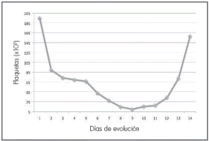 El paciente fue ingresado por un quiste renal derecho infectado con cambios inflamatorios reactivos del riñón ipsilateral, y se le comenzó tratamiento empírico con imipenem/cilastatina (500 mg/8 h) intravenoso. Transcurridos dos días, se constató disminución progresiva del recuento plaquetario, alcanzando en el noveno día cifras de 10.000/µL, descartando causas de trombopenia no farmacológica, y agregados plaquetarios (recuento plaquetario al ingreso 195.000/μL). Los hemocultivos fueron negativos; sin embargo, 48 horas después se aisló en el urocultivo E.coli pansensible. Ante la sospecha de trombopenia inducida por imipenem/ cilastatina se suspendió el fármaco instaurando tratamiento con ceftriaxona (2 g/24 horas); 48 horas después, la cifra de plaquetas aumentó progresivamente, desarrollando mejoría clínico-analítica y alcanzando una cifra de plaquetas normal (Figura 1).