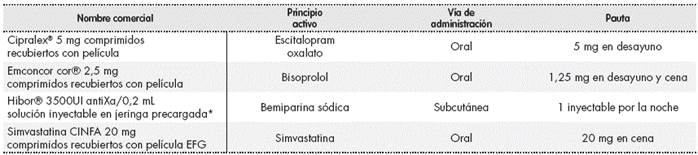 Mujer española, de 68 años de edad, 78 kg y 156 cm (IMC=32,1 kg/m2). Como antecedentes personales destacan: hipertensión arterial en tratamiento con bisoprolol 1,25 mg cada 12 h, hipercolesterolemia en tratamiento con simvastatina 20 mg al día, reflujo gastroesofágico sin tratamiento y síndrome ansioso en tratamiento con escitalopram 5 mg al día que la paciente refiere tomar desde hace varios años (Tabla 1). Además, la paciente es alérgica a sulfamidas y contraste yodado. Niega hábitos tóxicos.