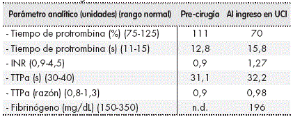 En cuanto a las pruebas analíticas, previo a la cirugía sólo se dispone de pruebas de coagulación anteriores al ingreso para la citorreducción (pruebas del 28/04/15), siendo todos los valores normales (Tabla 2), y la siguiente analítica se realizó al ingreso en UCI.