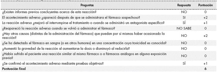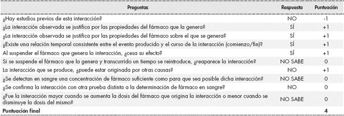 Para evaluar la posible interacción del medicamento con la planta medicinal se ha utilizado la escala propuesta por Naranjo, mediante la cual se ha obtenido una puntuación global de 6, que indica probable causalidad (Tabla 3). Además, puesto que la explicación a la reacción puede ser la interacción de ambos fármacos, se ha usado la escala de probabilidad de interacciones entre fármacos (DIPS) resultando una posible interacción entre escitalopram y té, con una puntuación de 3 (Tabla 4).