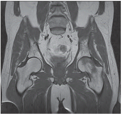 No hubo modificaciones en su tratamiento de base a la espera de la evolución del cuadro articular. En la revisión en Neurología realizada una semana después persistían el dolor articular y la impotencia funcional, por lo que se solicitó consulta en el Servicio de Cirugía Ortopédica y Traumatología (COT). Se realizó una resonancia magnética de cadera en la que se apreciaba un foco de alteración de la señal característico de edema difuso que afectaba a la mitad superior de la cabeza femoral, y se extendía ligeramente por el cuello femoral acompañado de derrame articular compatible con necrosis avascular estadio I (Figura 1).