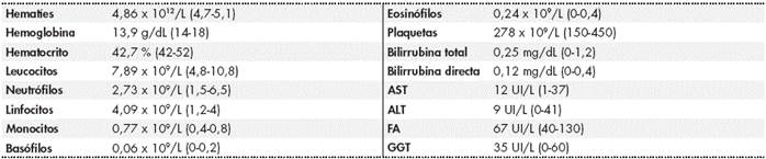 Las determinaciones de everolimus en sangre total en diciembre de 2015 y enero de 2016 mostraron unas concentraciones de 4,8 y 4,4 ng/ mL respectivamente, ambas ligeramente inferiores al límite bajo del rango terapéutico. Las muestras fueron analizadas en la Unidad de Farmacocinética Clínica del Servicio de Farmacia mediante cromatografía líquida de alta eficacia acoplada a espectrometría de masas (UPLC-MS/SM).
