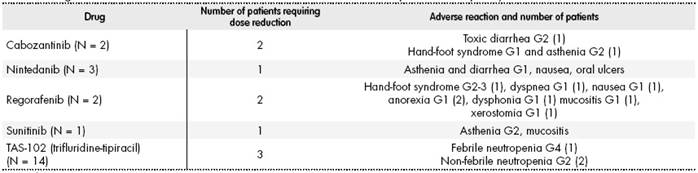 Regarding treatment safety, 26% of the patients (n = 9) required dose reduction due to treatment toxicity associated with 5 of the drugs (cabozantinib, nintedanib, sunitinib, regorafenib, and trifluridine-tipiracil). Regorafenib was associated with the majority of adverse reactions. The most common of these was asthenia (33%) followed by hand-foot syndrome (22%). Table 3 shows the adverse reactions requiring dose reductions. No treatment was discontinued because of its adverse effects.