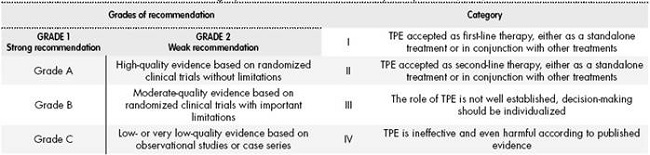 The ASFA guidelines were used to verify the appropriateness of the indications for TPE1,2. The Grading of Recommendations, Assessment, Development, and Evaluation (GRADE) system was also used. This system assigns grades of recommendation based on the quality of the published evidence (Table 1)3.