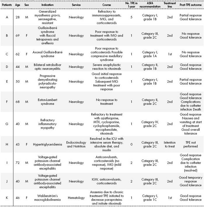 In conclusion, 80% of the treated patients experienced improvements. Although the ASFA guidelines were used to verify the appropriateness of the indications for TPE, no direct correlation was observed between the grade of recommendation and the response obtained. This study and its conclusions may be limited by the small sample size.