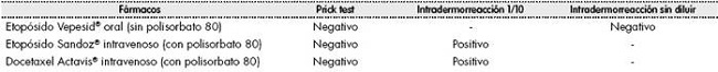Para ello, se realizaron las pruebas cutáneas (PC) habituales según protocolo de alergología. Se llevaron a cabo PC en prick test e intradermorreación con Etopósido Vepesid®, Etopósido Sandoz® y Docetaxel Actavis®. Este último fármaco contiene el polisorbato 80 y la paciente no se había expuesto a él previamente.