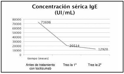 Inicialmente, ambos marcadores presentaron valores elevados; según la analítica realizada en enero de 2016, la Ig E fue de 73.686 UI /ml (parámetros normales: 10-100 UI/ml), y en julio de 2016 la VSG mostró un valor de 36 mm/h.