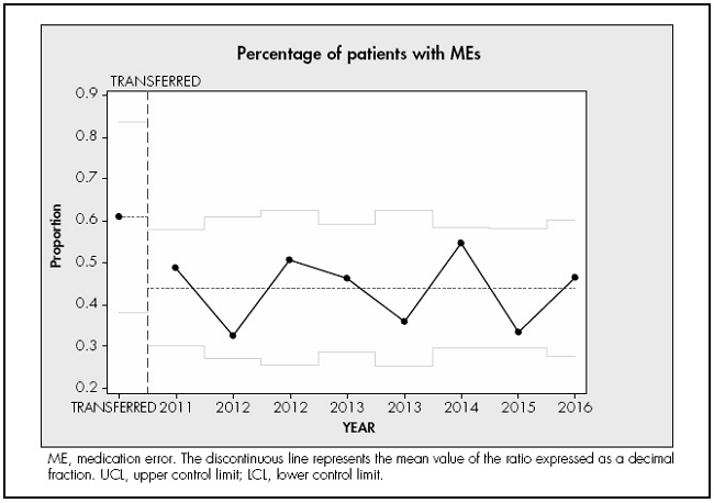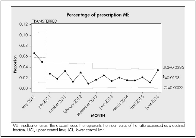 In conclusion, use of the sentinel patient program provides a general overview of the quality of the pharmacotherapeutic process and promotes a safety culture in hospitals. Statistical control charts are useful tools for monitoring MEs. Following the analysis of MEs in our hospital, improvement actions have been proposed for each stage of the pharmacotherapeutic process.