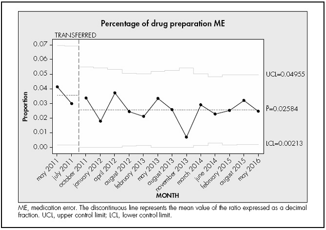The statistical control charts showed that there had been a steady decrease in medication preparation errors from 4% at the beginning of the study to 2.5% at the end of the study. Since 2011, actions have been implemented to increase safety in this stage, such as changes in work rounds, improvements in environmental conditions, and reductions in noise levels.