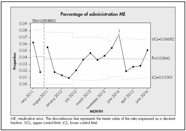 The rate of MEs in the administration stage not only decreased over the study period (6% at the beginning of the study and 3.7% at the end of the study), but also oscillated during the study period. This result may have been due to the difficulty of monitoring this stage and to the heterogeneity of working protocols at different hospitalization units. The observed improvement in MEs during this stage may have been due to the review and updating of administration methods in the electronic prescription software, and to staff training. The preparation of intravenous mixtures in the pharmacy service or the acquisition of ready-to-use medicines could reduce MEs associated with the dilution process, as well as shortening the time needed by ward nursing staff for medication preparation and administration.