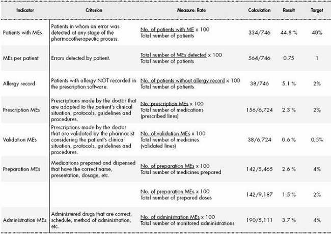 Variables: number of drugs prescribed, number of medications and doses prepared, number of medication administrations observed, type of ME, cause of ME, and recommendations and improvement actions. Safety indicators for each stage of the pharmacotherapeutic process were expressed as the ratio between MEs and opportunities for error. Quality evaluation was conducted by comparison with a target value that was based on experience in the study setting and the literature consulted9,11,12.