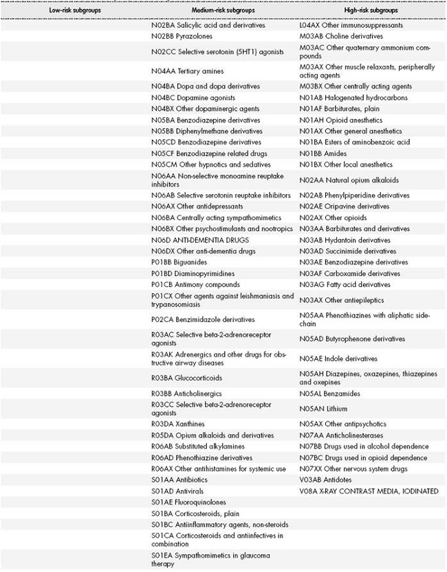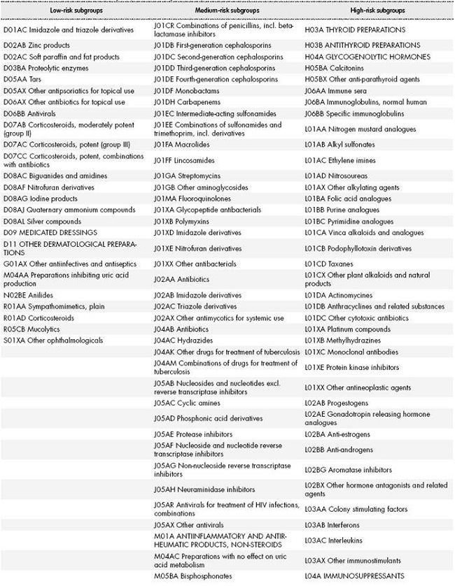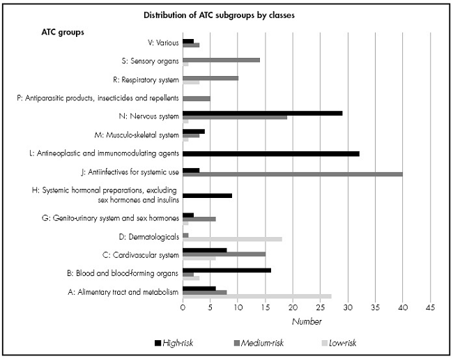 Results: A total of 298 Anatomical Therapeutic Chemical subgroups were evaluated. They were classified into three scenarios (low, medium, and high risk). In the first round, 266 subgroups were classified as appropriate to the assigned scenario, 32 were classified as uncertain, and none were classified as inappropriate. In the second round, all subgroups were classified as appropriate. The most frequent subgroups in the low-risk scenario belonged to group A “Alimentary tract and metabolism” (44%); the most frequent in the medium-risk scenario belonged to group J “Antiinfectives for systemic use” (32%); and the most frequent in the high-risk scenario belonged to group L “Antineoplastic and immunomodulating agents” (29%) and group N “Nervous system” (26%).
