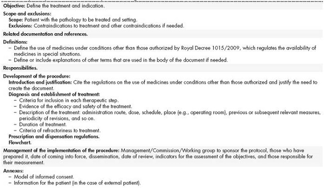 As mentioned, the use of medications under conditions other than those authorized involves respecting the established restrictions on the prescription and dispensation of the medications and following the health care protocol of the centre. This protocol (or protocols if it has been decided to design one for each active ingredient) must be agreed upon by the services involved in the use of the medication and approved by the Pharmacy and Therapeutics Commission and by the management of the health centre.