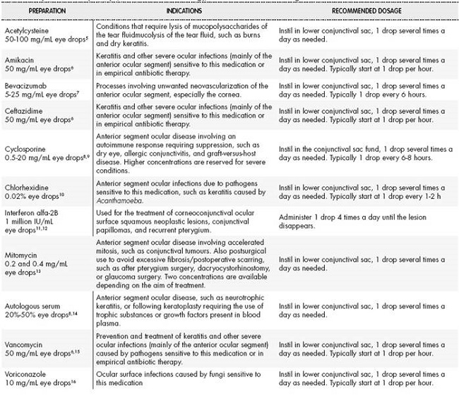 The members of the Spanish group of Hospital Pharmacy Compounding shared information on the ophthalmological medications they most frequently prepared in their own health centres, their indications, and the galenic and clinical evidence on which they were based.