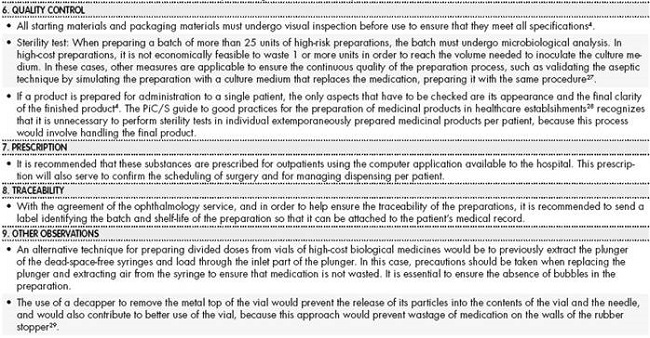 The objectives of this document are: (1) to establish which drugs and under what conditions there is sufficient pharmaceutical and clinical evidence to support their use other than that described in the summary of product characteristics in order to cover the most common therapeutic gaps in ophthalmological treatment, and thus facilitate the development of care protocols in health centres; and (2) to establish a set of general recommendations for the preparation of intraocular injections that are useful for the health personnel involved in their preparation and that increase patient safety.