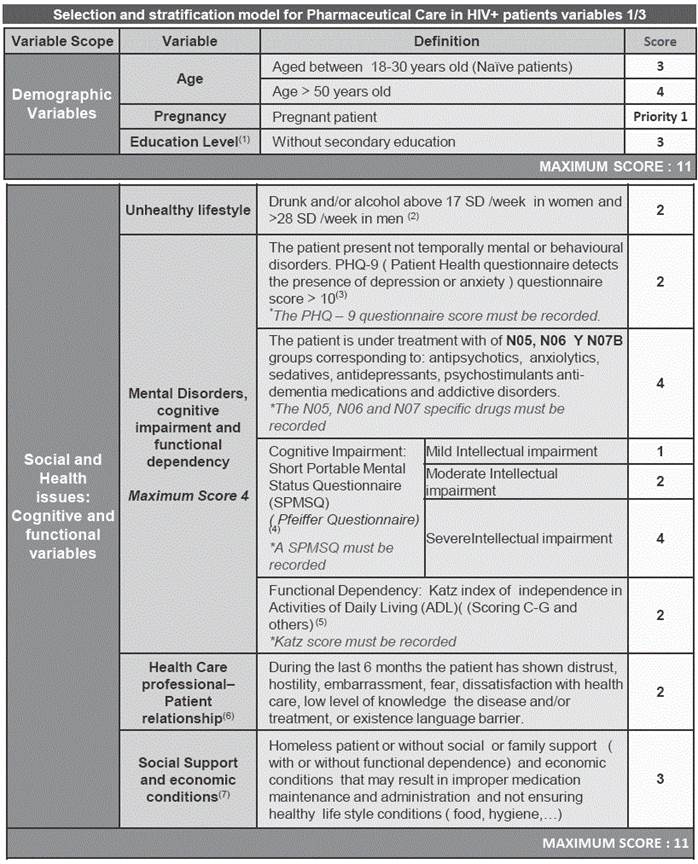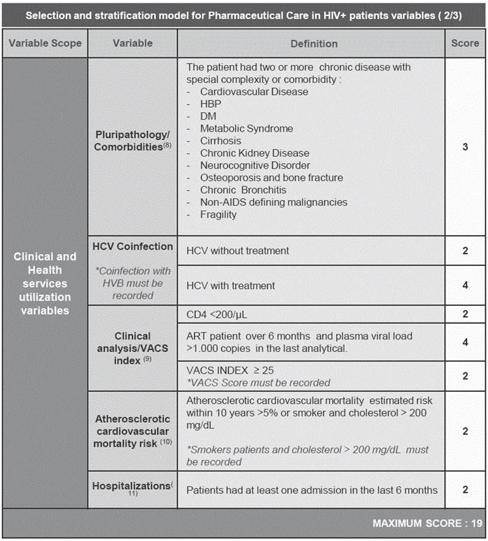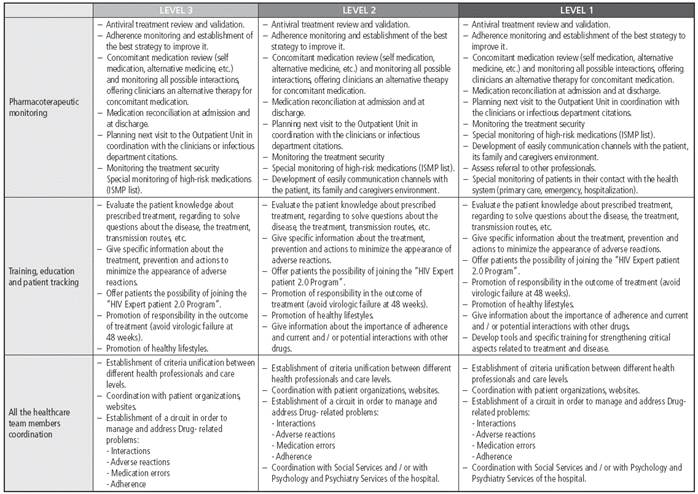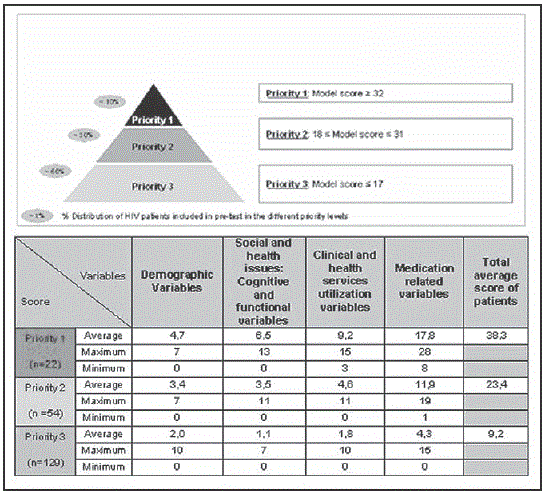 Methods:  A cross-sectional, multicenter study. An expert panel was created by Hospital Pharmacist experienced in PC for HIV-patients. The study was designed in 4 phases. The first phase included a review of literature and the development of a summary of the scientific evidence available. According to their score, patients were stratified into three levels of PC. In the second and third phases, a sample of patients was assessed and data information was recorded. The overall analysis also allowed pharmacists to define the actions to be applied at each level of priority. Finally, each stratification model was applied to a new sample of patients to verify their applicability and usefulness.
