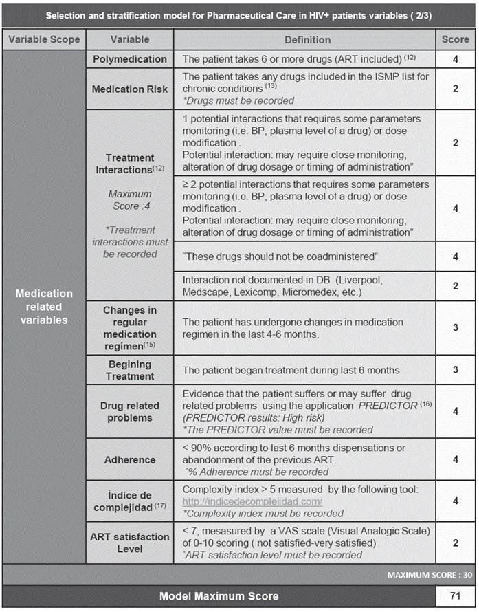 Lastly, the medication-related variables should include monitoring the complete treatment of the patients. In this section of the model you can get the highest weight in patient score, a total of 30 points out of 71 possible points. This is due to the important weight of polypharmacy, interactions, poor adherence and suspected drug-related problems when conducting patient monitoring and possible interventions21,22. Polypharmacy appears therefore as the main challenge in the pharmacotherapeutic approach for HIV+ patients in the next years22,23. As Cantudo R. et al.24 indicated the number of concomitant drugs decreased the adherence to ART. Therefore, this would lead to a clinical deterioration that would result in hospitalization, and it determines the need to act on patients25,26.