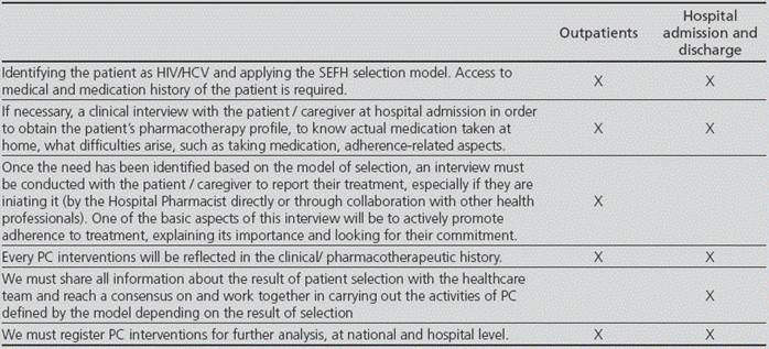 For the first time, our study support the design and adaptation of a selection and stratification model for PC in HIV+ patients to identify those who may benefit more from the intervention by the Hospital Pharmacist. Required actions and interventions for each kind of patients is also specified. It is necessary to include a comprehensive vision of Pharmaceutical Care and to involve further multidisciplinary collaboration.