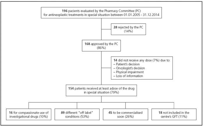 196 case histories of patients evaluated by the Pharmacy Committee after application for Medical Oncology service were studied. Out of the 196 applications, 168 (86%) were approved and 154 patients (92%) received at least a dose of medicine in special situations. Figure 1 describes the study flow chart. The median follow-up was 11 months (range 0-116 months).