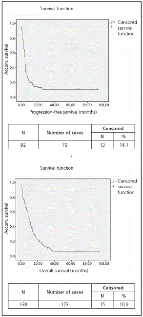 The median progression-free survival in 92 assessable patients was 5 months (range: 1 - 92) and the median overall survival in 138 assessable patients was 11 months (4-92). Figure 2 represents the progression-free survival and overall survival curves.
