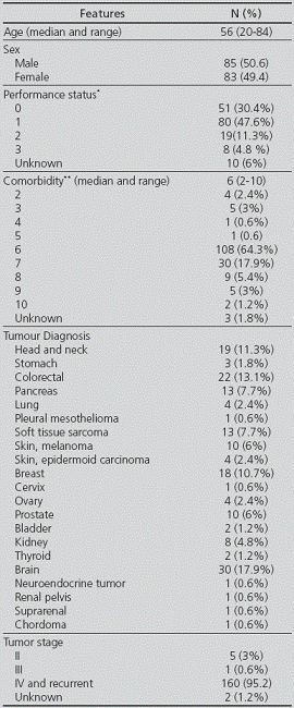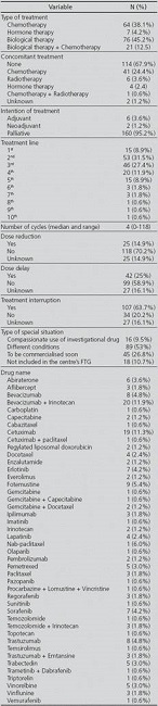 Resultados: 85 hombres y 83 mujeres, de 56 años de mediana de edad, tenían mayoritariamente tumores metastásicos tratados con una mediana de 4 ciclos (0-118) de quimioterapia, hormonoterapia o bioterapia, con finalidad paliativa entre 1.ª y 4.ª línea (80% de casos). La tasa de respuesta subjetiva fue 32,5%, objetiva completa 1,9%, parcial 8,8%, estabilización 15,6%, progresión 38,8% y no valorable 35,1%. La mediana de duración de la respuesta fue 2,5 meses (1-17), de supervivencia libre de progresión (SLE) 5 meses (4 - 21,3) y global (SG) 11 meses (9,2-20,6). En el análisis univariante, el estado funcional, la línea de tratamiento, el número de ciclos y el tipo de respuesta influyeron en la SG. En el modelo multivariante, el estado funcional (HR 0,36; IC 95% 0,17-0,77. P= 0,009) y el número de ciclos (HR 3,66; IC 95% 2,08-6,44. P= 0,0001) influían de forma independiente en la SG. La toxicidad grado 3 y 4 más frecuente fue la astenia (19%), la neutropenia (10,7%) y la emesis (8,9%).