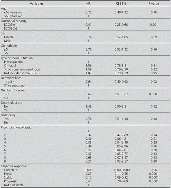 In the univariate analysis, the performance status variable measured by the ECOG scale influenced on overall survival, patients with higher functional impairment (ECOG 2 and 3) having worse survival in comparison to patients with better performance status (ECOG 0 and 1) (hazard ratio -HR- 0.41; confidence interval -CI- 95% 0.25-0.68. P= 0.001). Patients who received off-label drug in the first or second line also enjoyed higher survival than patients who received them in subsequent lines (HR 0.64; CI 95% 0.49-0.93. P= 0.02). Patients who received less cycles of off-label drugs (1 to 2 cycles) had shorter survival than those who received more cycles (3 or more); HR was 3.67 (CI 95% 2.51-5.37. P=0.0001). Finally, patients with partial response (HR 0.23; CI 95% 0.11-0.45.