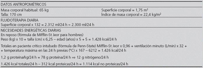 Paralelamente el paciente desarrolló íleo paralítico secundario a la sedación. El equipo médico solicitó a la Unidad de Nutrición Artificial de nuestro servicio la valoración del paciente para iniciar nutrición parenteral total (NPT). En la siguiente Tabla 1 se exponen los cálculos iniciales que se realizaron para su diseño.