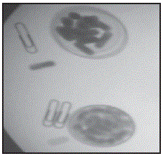 Se insta a la paciente a que aporte la medicación que está tomando, siendo esta un complemento alimentario llamado “VATA VITWANSA” (Figura 2), que se remite al Instituto de Toxicología del Hospital Central de la Defensa (Hospital Universitario Gómez-Ulla) para su análisis toxicológico. Se detectan concentraciones de Pb de hasta 19.240 µg por g de comprimido. Además, se le realiza un estudio mediante rayos X, siendo estos radiopacos (Figura 3), por lo que finalmente se determina el consumo de dicho complemento alimentario como causa principal de la intoxicación por Pb, con una relación clasificada como definitiva según el algoritmo de Naranjo para evaluar la causalidad de una RAM4.