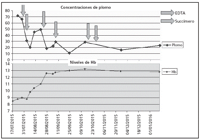 Al finalizar el primer ciclo de tratamiento con DMSA se observa una disminución progresiva de las concentraciones de Pb en sangre. Sin embargo, al realizar un control a la semana siguiente de terminar el primer ciclo, se observa un aumento de Pb en sangre, por lo que se decide administrar un nuevo ciclo con DMSA.
