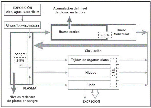 El Pb, una vez en el organismo, circula por la sangre unido a eritrocitos (95%), se distribuye a los tejidos blandos como hígado, riñón, médula ósea y sistema nervioso y, finalmente, se acumula en hueso, donde es inerte y poco tóxico. Aquí tiene una vida media de décadas y contiene el 95% del Pb del cuerpo. Este es liberado del hueso en ciclos de recambio como hipertiroidismo, menopausia, embarazo y lactancia, lo que da lugar a fluctuaciones de sus concentraciones sanguíneas sin que exista una aportación externa (Figura 4 y Figura 5).