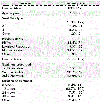 Demographical variables were collected (age, gender), as well as variables regarding Hepatitis C, such as viral genotype and the presence or not of liver cirrhosis, and the status before treatment initiation. Patients were classified into naïve, relapsing responders (RR) or non-responders (NR) to previous treatments.