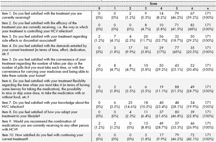 The primary endpoint of the study was the assessment of satisfaction with treatment for Hepatitis C, measured through the ESTAR questionnaire13 adapted to the patient population with Hepatitis C. This tool included 10 questions to be answered with a Likert scale, from 0 (Not at all satisfied) to 6 (Extremely Satisfied); therefore, overall satisfaction with treatment for Hepatitis C ranged between 0 and 60 scores. The questionnaire was structured into two dimensions: Clinical Satisfaction (items 1,2,3,9 and 10) and Satisfaction with Lifestyle (items 4,5,6,7,8). The first section addressed aspects about satisfaction with treatment: its efficacy, adverse reactions and requirements entailed, likely recommendation to other patients, and willingness to continue their current treatment. The section regarding lifestyle analyzed matters associated with treatment convenience and flexibility, awareness about the disease, and adaptation of treatment to their lifestyle. There was also a qualitative assessment of this satisfaction score: <50/ >=50 scores, low or high satisfaction, respectively.