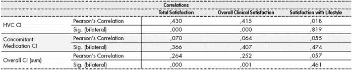 The statistical analysis demonstrated the correlation between the Complexity Index and Satisfaction (Table 3). The relationship between the complexity index of the treatment for HVC and satisfaction determined that a reduction in 5 scores in the complexity index of the treatment for Hepatitis C multiplied by four the value of Satisfaction with Treatment (p<0.0001). Similarly, 12 scores less in the Complexity Index of the Concomitant Medication allowed to double Patient Satisfaction (p=0.028).