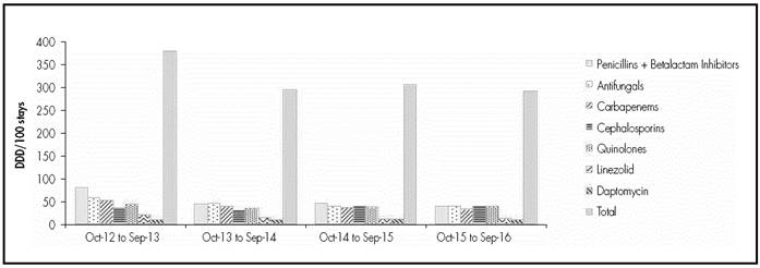 It is worth highlighting that, unlike what has been published for other groups of patients9,28 the implementation of the ASP program has not represented a reduction in mean stay or mortality. So far, there have been few studies analyzing the impact of this type of programs on the clinical evolution of critical patients. Elliggsen and cols29, in their prospective study with 1-year intervention, observed that the implementation of an ASP program focused on specific antimicrobial groups achieved a reduction in their use, as well as the incidence of infection by C difficile, but there was no reduction in hospital stay or mortality. Taggart and cols30 also described the impact of an ASP program in a medical-surgical ICU. After one year of intervention, they did not observe significant reductions in mean stay and mortality. In this study, the authors reached the conclusion that studies with longer duration are necessary in order to assess the impact of the ASP on clinical evolution and resistances.