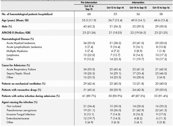 The design of the study was quasi-experimental and pre-post intervention. The ICU where the program was implemented is a medical ICU with 24 beds, in a tertiary hospital with 961 beds, which receives 1735 admissions per year as average, during the 2013-2015 period. This study included all those patients with haematological disease who were admitted to the Critical Patient Unit from October, 2013 to September, 2016.