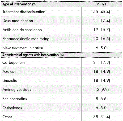 Additionally, in those patients for whom an intervention was conducted, there was an evaluation of the number of relapses of the infectious condition after the intervention. A relapse of the infectious condition was described as the new presentation of the infectious episode that required the re-introduction of the antimicrobial agent withdrawn, or the modification of the dosing regimen after the intervention by the ASP, within 72 hours after said intervention.