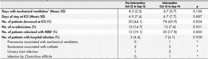 The statistical analysis was conducted through the Stata v.13.0 program. Comparison of variables between the pre and post intervention groups was performed through parametric tests (Fischer, Student’s t) or non-parametric tests (χ2, Mann-Whitney’s U), according to the normality analysis of the sample. Mortality at 30 days of admission in the unit was analyzed with Cox Regression.