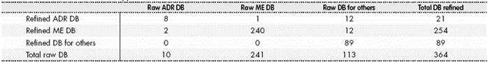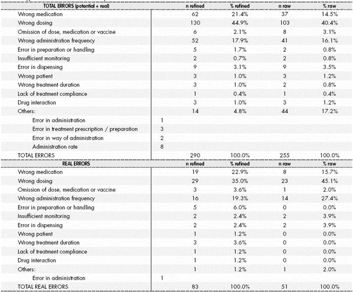 The frequency of the different types of error identified appear in Table 4, for Total Errors and Real Errors. Refinement reduced the percentage of errors classified as “others”, due to re-classification into types of error already defined. Said table shows the total number of errors detected, which is superior to the number of entries classified as ME, because each record can contain more than one error.