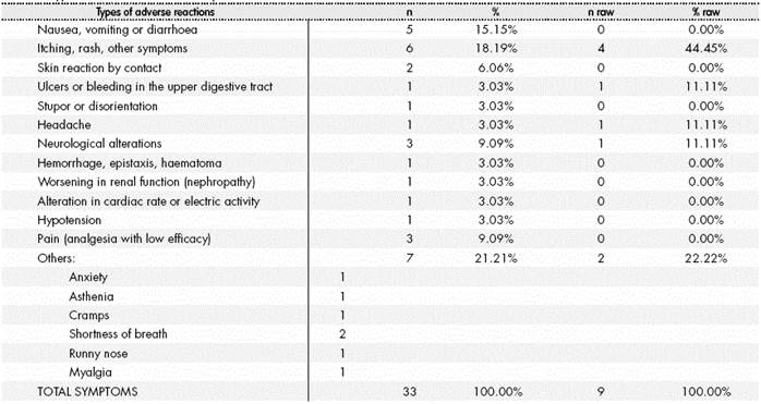 The dates for ADR reports were correct in 100% of cases. These were discovered in 61.9% of cases by the Primary Care Physician, followed by the staff at the Home Hospitalization Unit, with 9.5% of cases. In the unrefined database, 11 inconsistencies (52.4%) were found in terms of impact on healthcare, and 13 (61.9%) in the reported effect of the ADRs. All of them were re-codified according to the damage described in the field “describe_what_happened”. From this same field, 16 of the 21 medications causing the ADR were retrieved. The other 5 did not appear in any field in the original database.