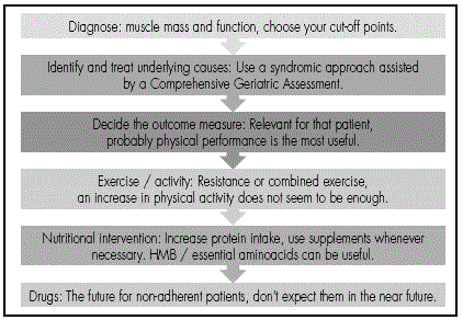 Once established, it will be important to detect sarcopenia at the earliest stage possible. There are data suggesting that severe sarcopenia is more difficult to reverse than mild sarcopenia. The first step is to identify and treat its causes, generally through a Comprehensive Geriatric Assessment and a sequential therapeutic approach (Figure 1). Nutritional intervention and exercise will be the basis of treatment18. There are no medications approved for sarcopenia, though some are already in clinical research19.