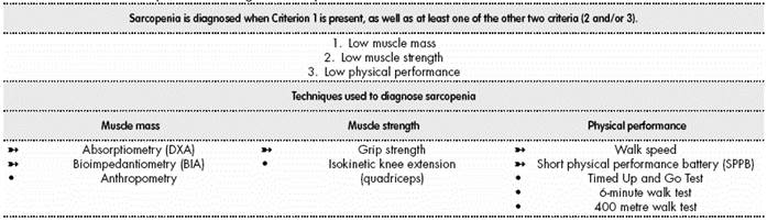 In clinical practice, three measurements are needed in order to diagnose sarcopenia: muscle mass, muscle strength, and physical performance (Table 1). It must be considered that the cut-off points for each measurement can vary according to gender and age, and often also to race or country of origin. Densitometry is becoming the standard procedure for measuring muscle mass; this can be conducted with the same equipment used for bone densitometry. Appendicular mass (of the limbs) will often be measured. The usual alternative is bioimpedantiometry, which is a portable test. Many pharmacies and obesity clinics have foot bioimpedance meters, which are the least reliable in measuring muscle mass. Usually, the equation calculated by the device is not valid; in many of them it will only provide the lean mass percentage; it is recommended to use a standard equation such as Janssen’s6. The easiest measurement of muscle strength is a hand grip device. Physical performance (a concept addressing the physical ability of the whole body, and not that of an isolated muscle) it can be measured with simple tests, such as a four-meters gait speed test.