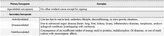It is convenient to remember that sarcopenia is not the only disease which causes a generalized loss of muscle mass. This can be caused by other conditions mostly malnutrition and cachexia, and it is not always easy to differentiate between these three problems7, which can be interlinked, and therefore difficult to separate. Malnutrition causes loss of (lean) muscle mass as well as fat mass, and it is caused by an inadequate update of nutrients. In cachexia, the loss of lean and fat mass is caused by a severe disease such as cancer. In sarcopenia, the fat mass is usually normal or increased; the latest is known as sarcopenic obesity8.