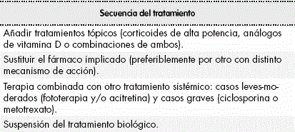 En los pacientes con un cambio de la morfología de la psoriasis, como en la mayoría de los casos no es grave, la opción inicial más utilizada es el mantenimiento del mismo fármaco con la misma dosis y prescribir un tratamiento tópico, a no ser que las lesiones se agraven, en cuyo caso se recomienda el uso de otro biológico a poder ser con diferente mecanismo de acción, siendo la última opción la suspensión del tratamiento5 (Tabla 1). Esta reacción fue notificada al Centro Regional de Farmacovigilancia.