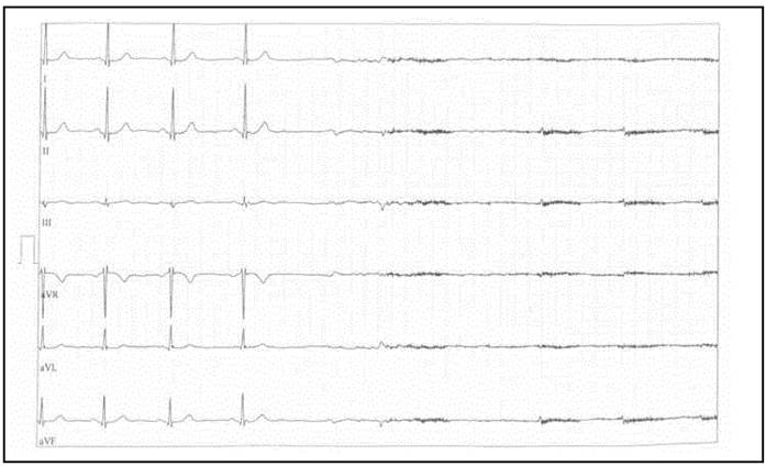 Al no estar disponible dipiridamol para su adquisición, se empleó en su lugar regadenosón a dosis estándar como vasodilatador coronario (400 mcg). De forma casi inmediata (tras 26 segundos), el paciente entró en asistolia (Figura 1), revertida a los 24 segundos mediante golpe esternal y administración intravenosa de un bolo de teofilina. Los electrocardiogramas realizados posteriormente en la sala de parada no mostraron alteraciones significativas, y no se percibieron signos de alteración isquémica. Analíticamente, los principales marcadores cardiacos no se incrementaron significativamente: la creatina-cinasa (CKMB) se elevó ligeramente (6,1 ng/mL, rango 0-5 ng/mL), pero en proporción fisiológica respecto a la CK total (CKMB/CKT 2,77%, rango 0-4%). Apenas se detectó troponina I (TnI 0,01 ng/mL).