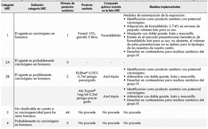 Así, existen multitud de productos sanitarios que contienen compuestos potencialmente peligrosos para la salud de los profesionales sanitarios y que, por tanto, deben de manipularse con una serie de medidas de protección. En esta línea se realizó una revisión de la composición de los productos sanitarios incluidos en el hospital, contrastándola con el listado de compuestos evaluados y clasificados por la International Agency for Research on Cancer (IARC)4 en cuanto a su potencial carcinógeno. De un total de 776 productos sanitarios, 47 (6,1%) contienen algún compuesto incluido en el listado de compuestos evaluados por la IARC. De estos 47, la mayoría (44) contienen compuestos clasificados en el grupo 3 (el compuesto no es clasificable en cuanto a su carcinogenicidad en humanos), por lo que no requieren medidas de protección adicionales para su manipulación. No obstante, 2 contienen compuestos del grupo 2B (el compuesto es posiblemente carcinógeno en humanos) y 1 contiene compuestos del grupo 1 (agente cancerígeno), por lo que requieren medidas de protección para su manipulación. La clasificación de potencial carcinógeno de la IARC, los productos sanitarios que contienen compuestos con potencial carcinógeno y las medidas implementadas en cada caso se recogen en la Tabla 1.