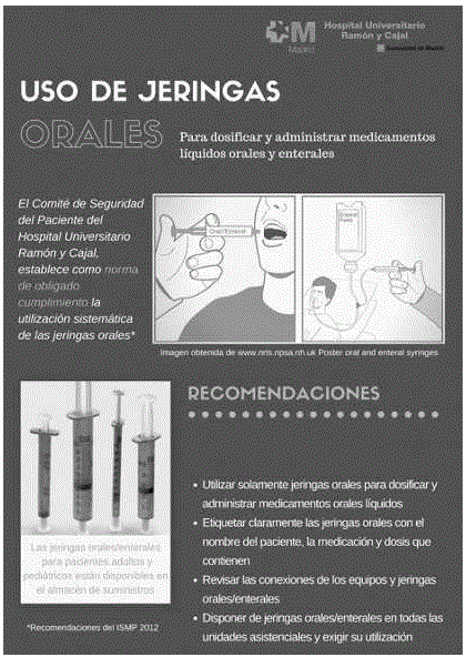 In Spain, the Institute for Safe Use of Medications (ISMP) publishes periodical newsletters and educational programs, which have highlighted the importance of using oral syringes for preparing and administering liquid medications through oral administration 4,5. Even though there has been an increase in the use of these syringes in recent years, there are still some centres where they are not available, or healthcare professionals are not using them, either due to lack or knowledge or because they think that this type of error will never happen to them5.